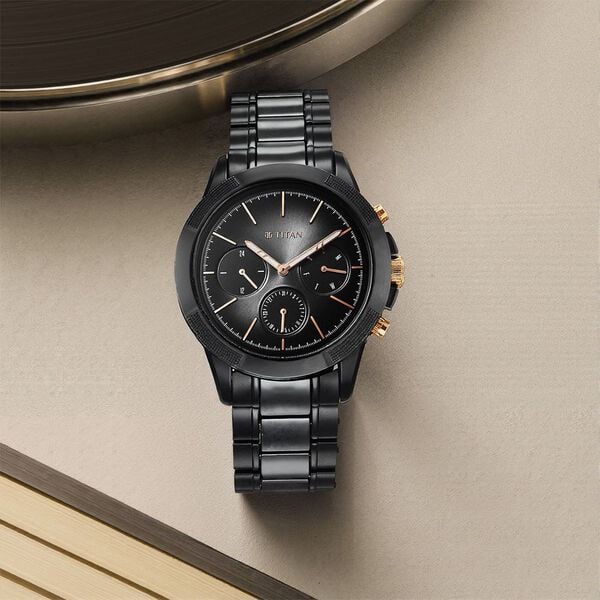 Titan Quartet Black Dial Analog with Day and Date Steel and Ceramic Strap watch for Men