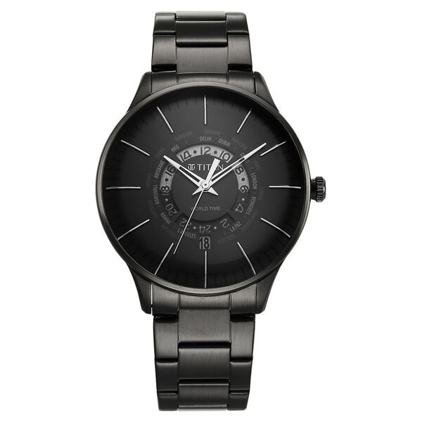 Titan Black Dial World Time with Date Stainless Steel Strap watch for Men